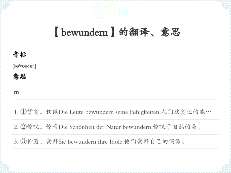 ②惊叹,惊奇Die Schönheit der Natur bewundern.惊叹于自然的美。