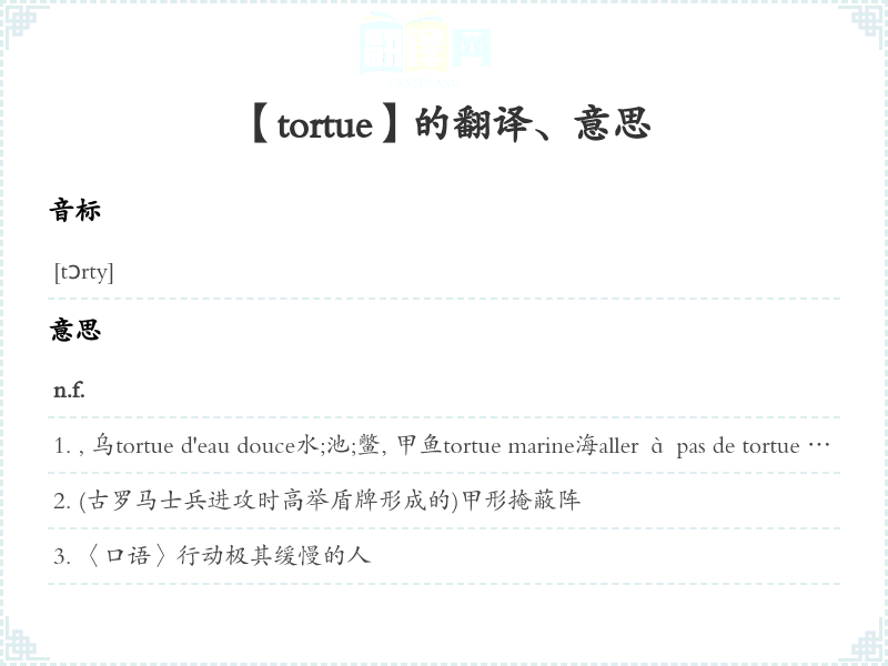 , 乌tortue d'eau douce水;池;鳖, 甲鱼tortue marine海aller à pas de tortue , aller comme une tortue 〈转义〉走得极慢Quelle tortue , c'est une vraie tortue !〈转义〉慢得真像乌!