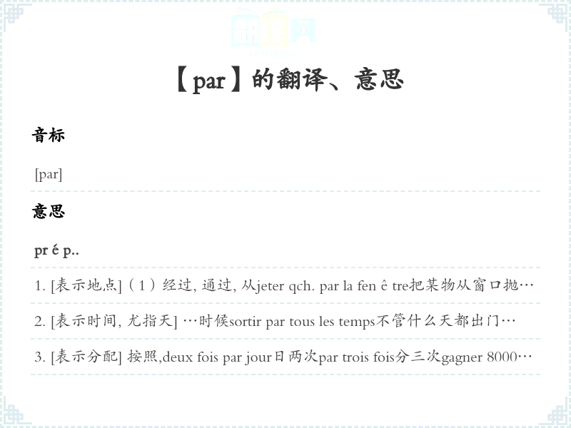 [表示起点或终点] 以finir par la victoire以胜利结束par troploc.adv.实太过分地par -làloc.adv.这里或那里, 有些地方;有时候de parloc.prép.因为, 由于;以…的名义de par la loi根据法律n.m.(高尔夫球赛中的)标准杆数