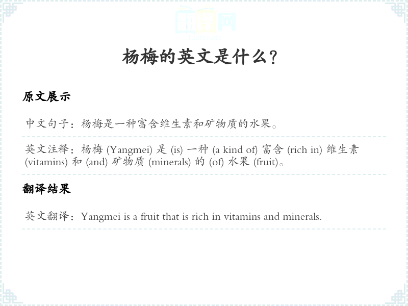 通过本篇文章的学习,希望你能够对"杨梅是一种富含维生素和矿物质的水果。"这个词的翻译及相关用法有一个全面的理解,并在实际应用中灵活运用。