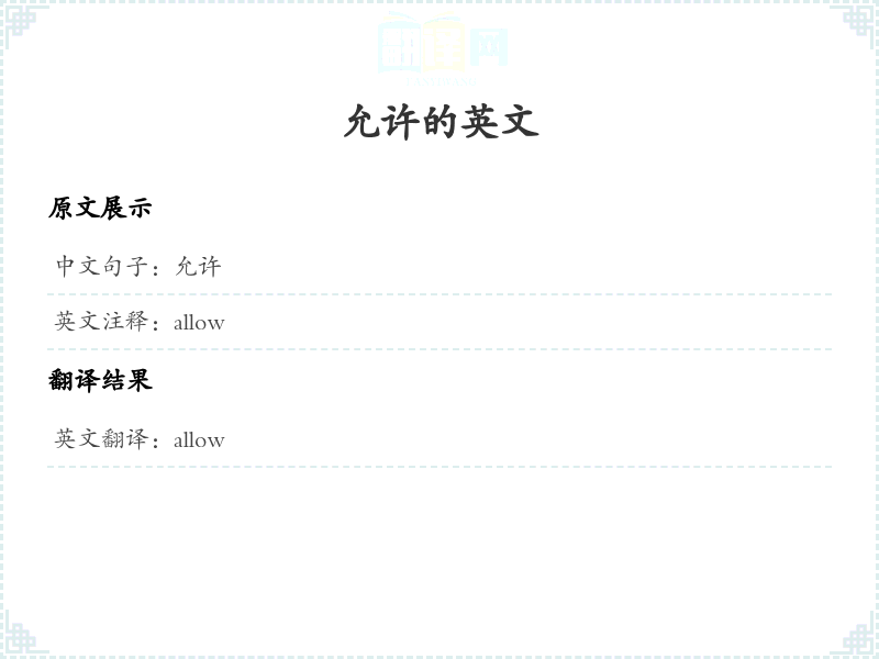 - 在翻译过程中,'允许'这个词的核心含义是给予某种权利或同意做某事。在英语中,'allow'这个动词表达了相同的意思,通常用于表示允许某人做某事或允许某事发生。