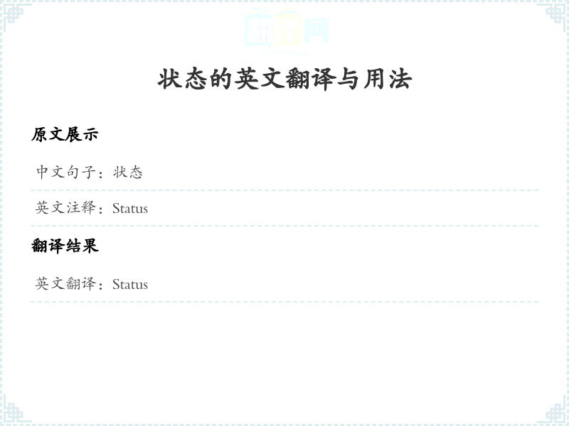 - 在翻译过程中,'状态'这个词的意思是指某个事物的当前情况或状态。这里没有特别复杂的词汇,因此直接翻译为 'Status' 是最贴切的。