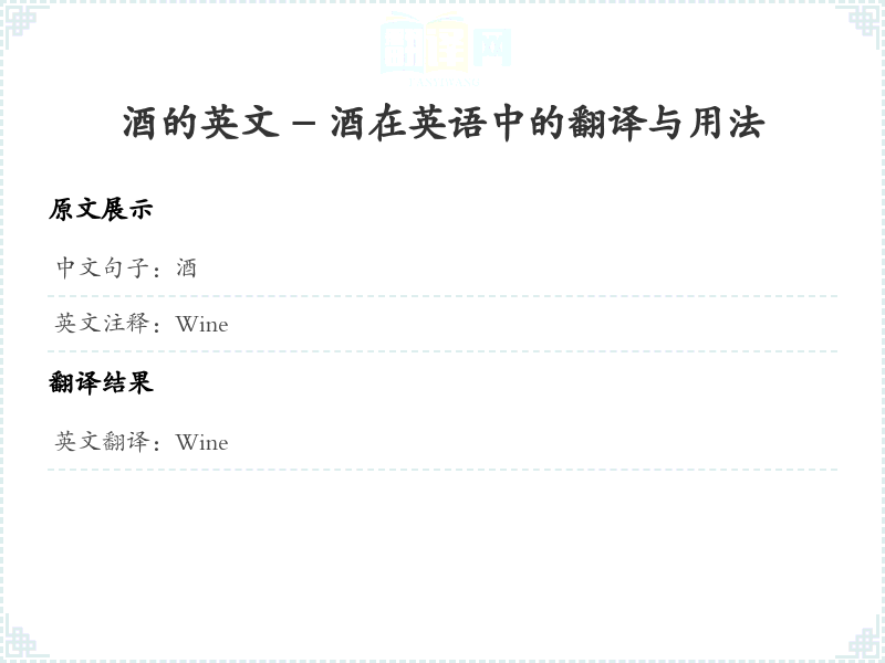 - 在翻译过程中,将中文的“酒”直接翻译为英文的“Wine”,因为在英语中,‘Wine’特指由葡萄发酵而成的酒类,符合中文的使用习惯。