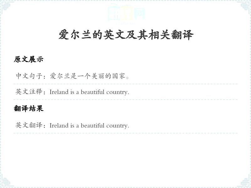 通过本篇文章的学习,希望你能够对"爱尔兰是一个美丽的国家。"这个词的翻译及相关用法有一个全面的理解,并在实际应用中灵活运用。