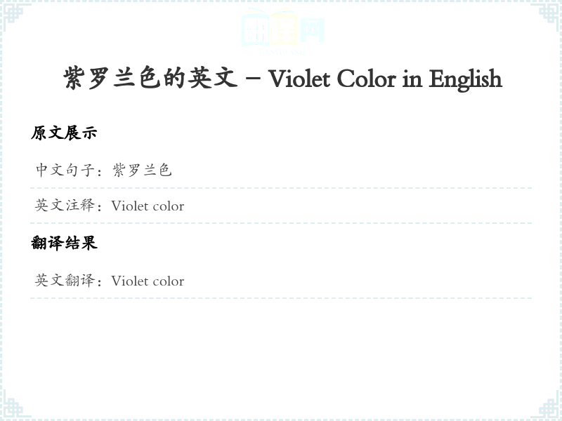 - 在翻译过程中,考虑到色彩的名称通常是直接翻译的,因此‘紫罗兰色’被翻译为‘Violet color’,其中‘紫罗兰’指的是一种特定的颜色,而‘色’则用‘color’表示。整体翻译简洁明了,符合英语的表达习惯。
