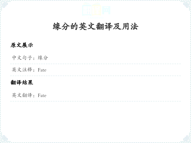 - 在翻译过程中,'缘分'这个词可以理解为人与人之间的命运或关系,强调了人与人之间的联系。英文中的'fate'表达了类似的概念,但在不同文化背景下可能有不同的理解。这里选择'Fate'作为翻译,既简洁又能传达原意。