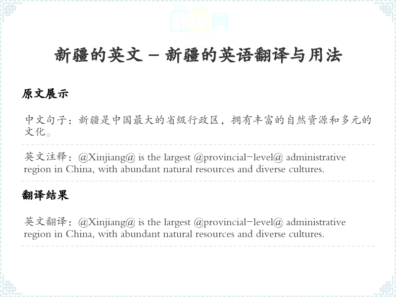通过本篇文章的学习,希望你能够对"新疆是中国最大的省级行政区,拥有丰富的自然资源和多元的文化。"这个词的翻译及相关用法有一个全面的理解,并在实际应用中灵活运用。