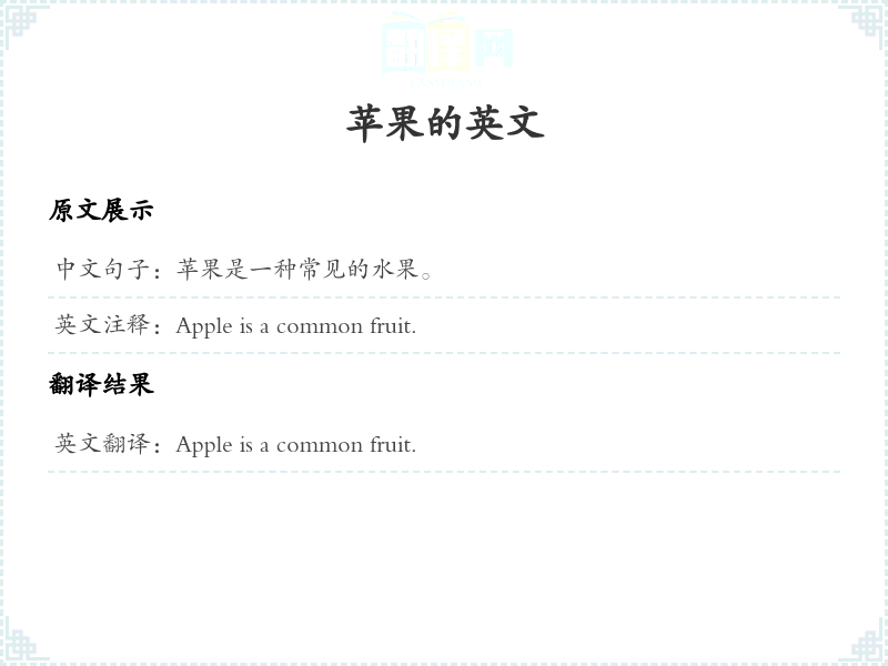 - 在翻译过程中,首先识别关键词,然后将其逐一翻译,同时保持句子的整体结构和语义通顺。这里的关键词是“苹果”(Apple)和“常见的水果”(common fruit),它们是这个句子的核心成分。