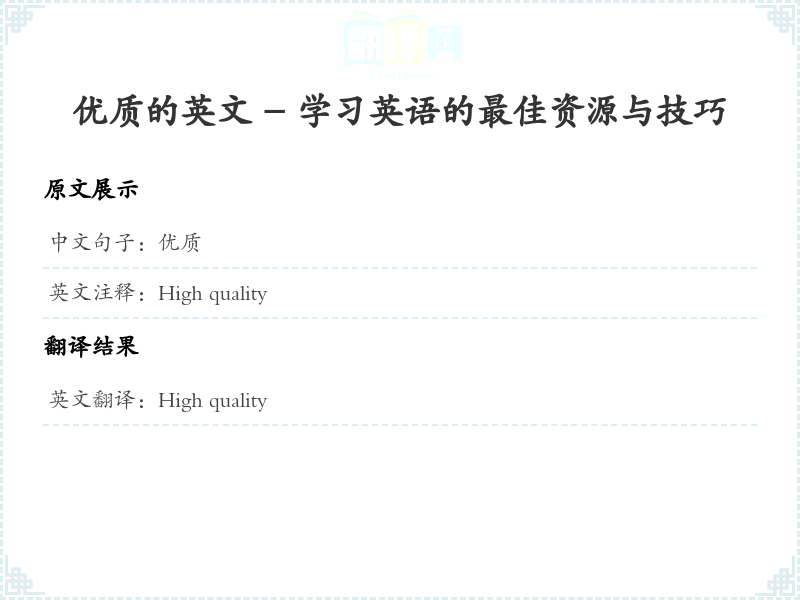 通过本篇文章的学习,希望你能够对"优质"这个词的翻译及相关用法有一个全面的理解,并在实际应用中灵活运用。