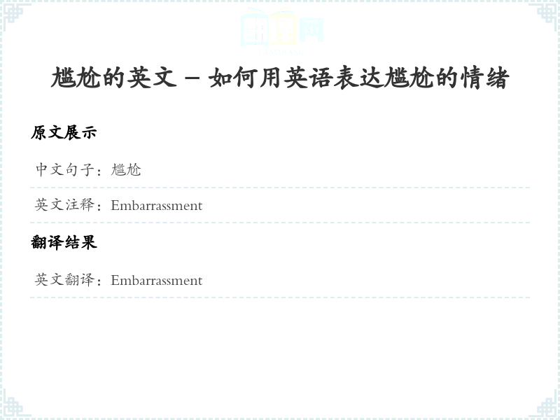 - 在翻译过程中,考虑到语境,'尴尬'在英语中最常用的对应词是 'Embarrassment'。这个词不仅涵盖了情感上的不适,还能够传达出社交场合中的不便和窘迫感。