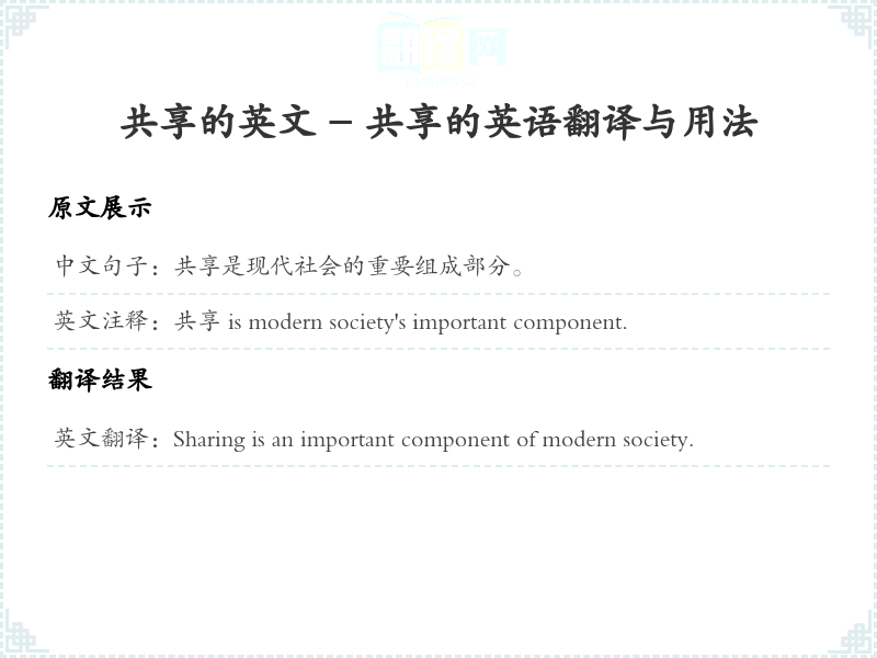 通过本篇文章的学习,希望你能够对"共享是现代社会的重要组成部分。"这个词的翻译及相关用法有一个全面的理解,并在实际应用中灵活运用。