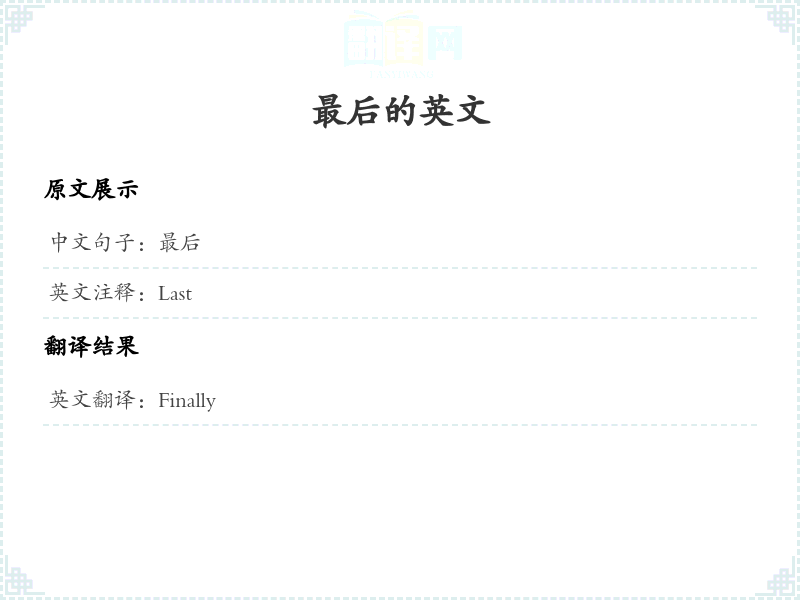 - 在翻译过程中,'最后'可以理解为时间上的最后一个环节或结果,因此选择了'Finally'这一词汇。这个词常用于列举或总结时的最后一部分。
