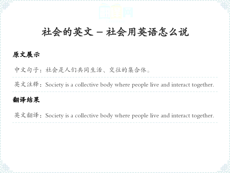 通过本篇文章的学习,希望你能够对"社会是人们共同生活、交往的集合体。"这个词的翻译及相关用法有一个全面的理解,并在实际应用中灵活运用。
