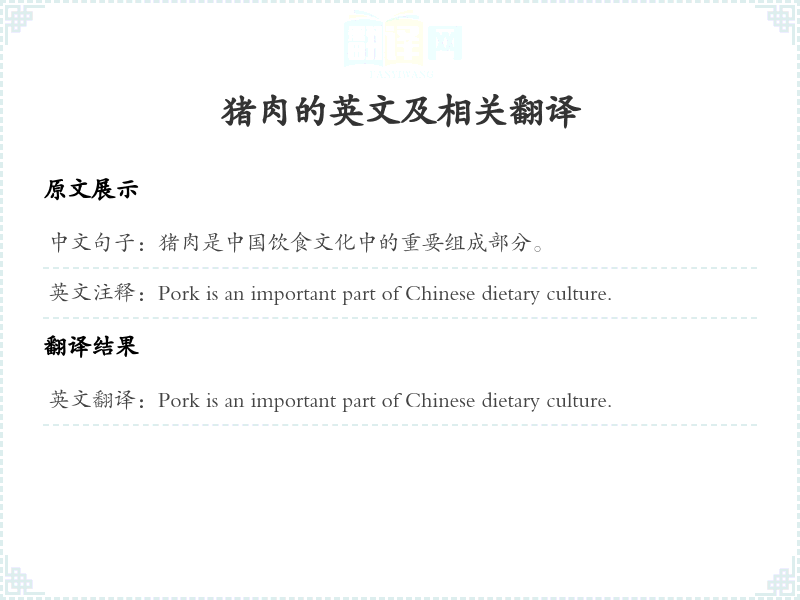 通过本篇文章的学习,希望你能够对"猪肉是中国饮食文化中的重要组成部分。"这个词的翻译及相关用法有一个全面的理解,并在实际应用中灵活运用。