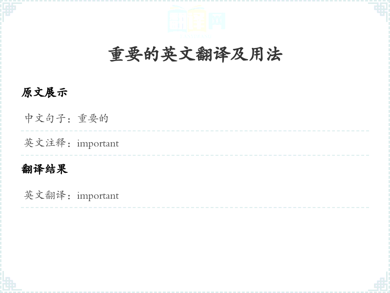 - 在翻译过程中,首先识别出中文的核心意思,然后选择最合适的英文词汇来传达相同的含义。这里的“重要的”直接翻译为“important”,这是一种常见且准确的翻译方式。