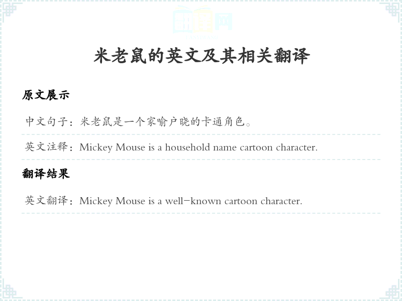 通过本篇文章的学习,希望你能够对"米老鼠是一个家喻户晓的卡通角色。"这个词的翻译及相关用法有一个全面的理解,并在实际应用中灵活运用。