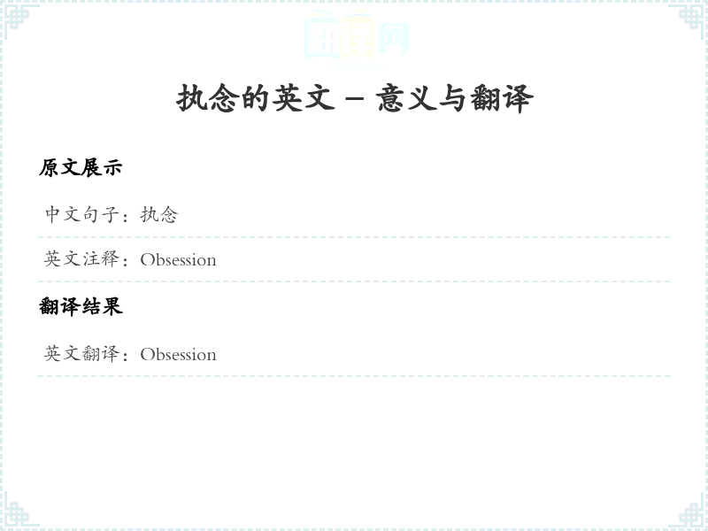 - 在翻译过程中,'执念'通常指一种强烈的执着或困扰。这里选择'Obsession'作为翻译,因为它能准确传达出这种执着的感觉。