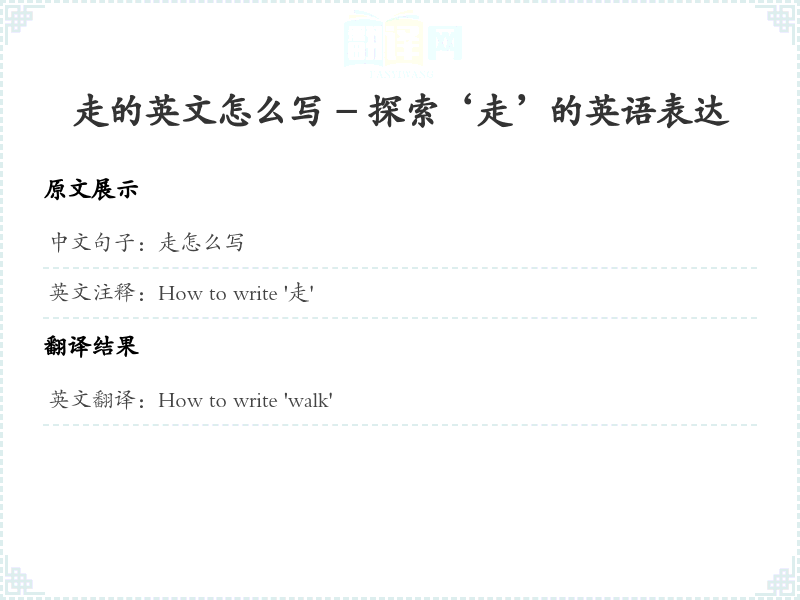 - 在这个句子的翻译中,我们将'走'翻译为'walk',因为这是最常用的对应词。'怎么写'可以直接翻译为'how to write',此处表明了询问的语气。整体保持了句子的简洁性和准确性。