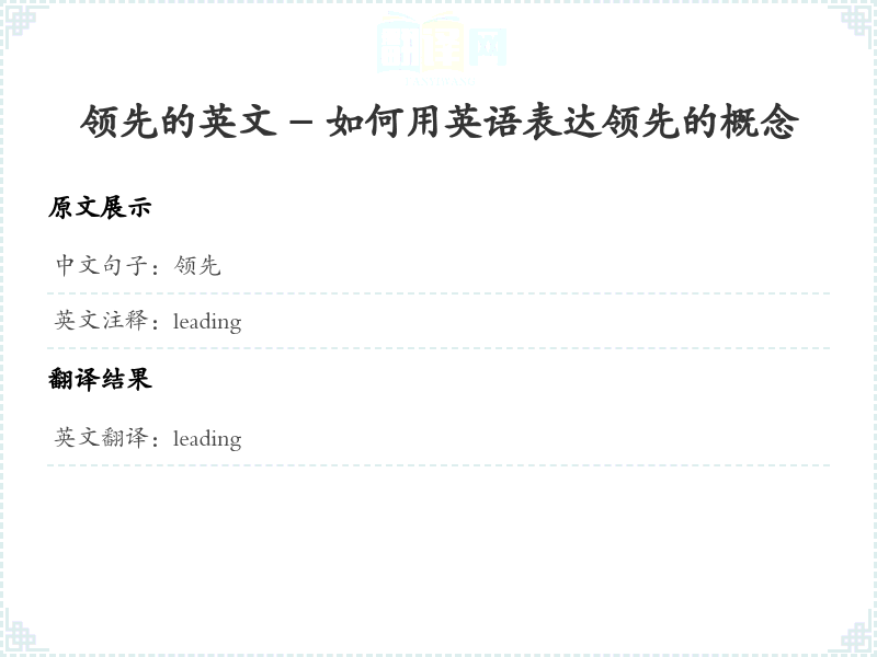 - 在翻译过程中,'领先' 这个词在英语中对应 'leading',表示在某个领域或活动中处于前列或占据主导地位。该词通常用于描述企业、个人或技术的优势地位。