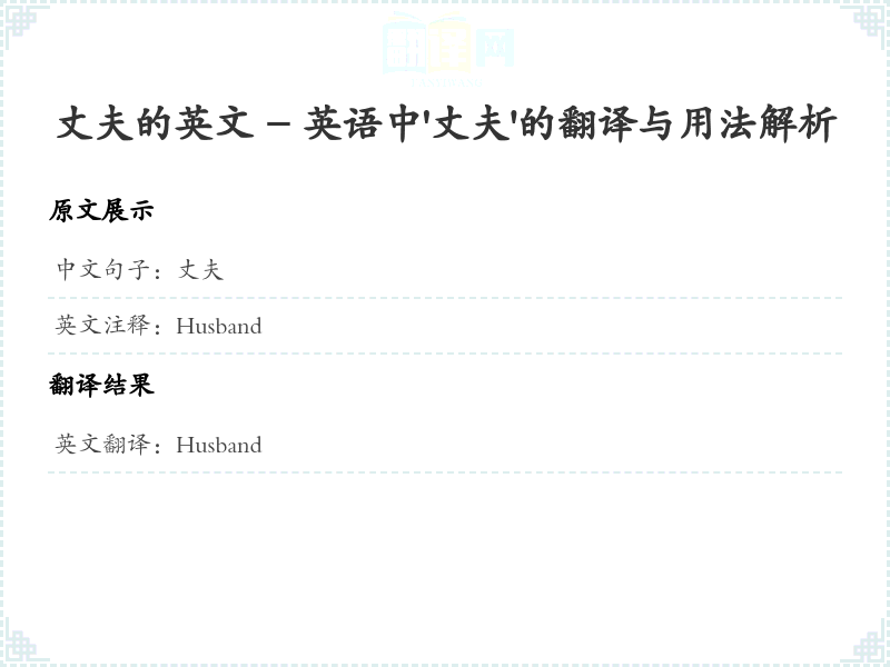 - 在翻译这个词时,直接使用'丈夫'的英文对应词'Husband',因为这是一个特定的家庭角色,翻译时没有其他意思需要考虑。