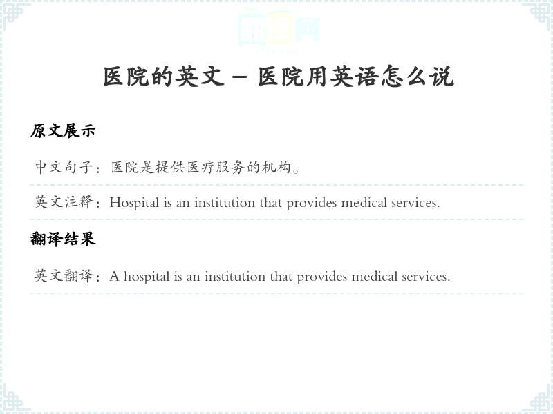 通过本篇文章的学习,希望你能够对"医院是提供医疗服务的机构。"这个词的翻译及相关用法有一个全面的理解,并在实际应用中灵活运用。