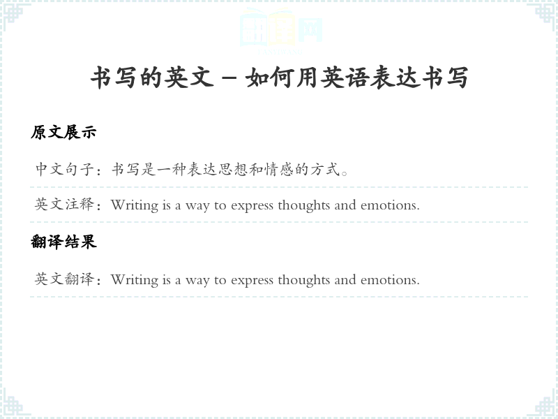 通过本篇文章的学习,希望你能够对"书写是一种表达思想和情感的方式。"这个词的翻译及相关用法有一个全面的理解,并在实际应用中灵活运用。