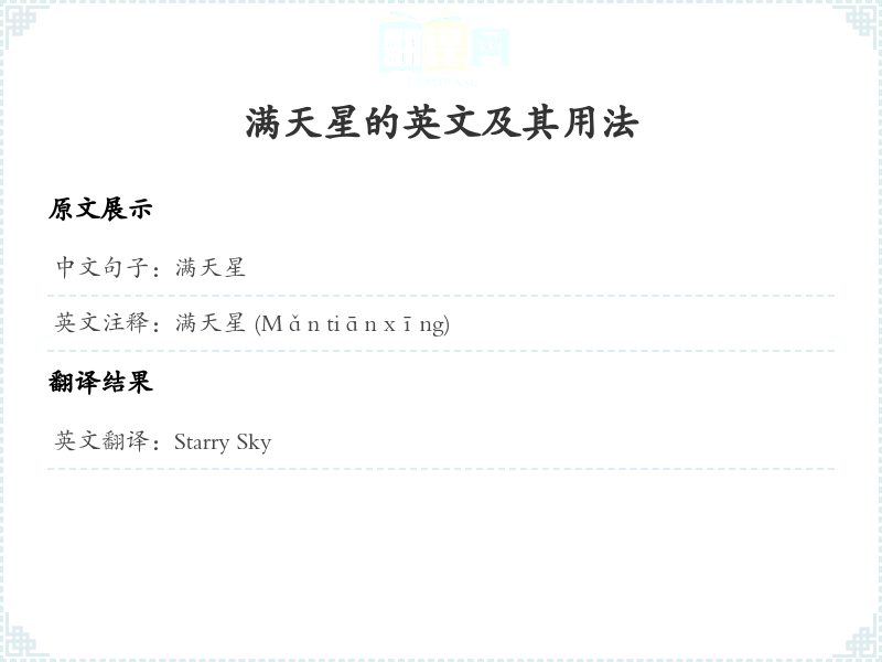 - 将中文中的“满天星”翻译为英文时,考虑到其字面意思,使用了‘Starry Sky’这个短语,既表达了夜空中繁星密布的景象,也能传达出一种浪漫和诗意的感觉。