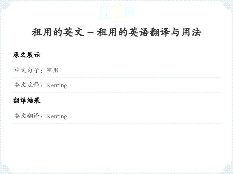- 本句的翻译思路是将中文的动词“租用”直接翻译为英文的动词“Renting”。这个词是一个常用的商业术语,表示以一定费用使用他人财产或服务的行为。