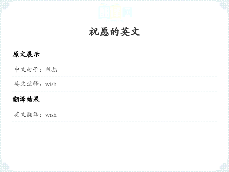 - 在中文中,'祝愿'表示对他人或事物的美好期望或希望。它通常用于表达对未来的良好祝福。在翻译时,选择' wish'是因为它能够准确传达这种希望和期盼的含义。