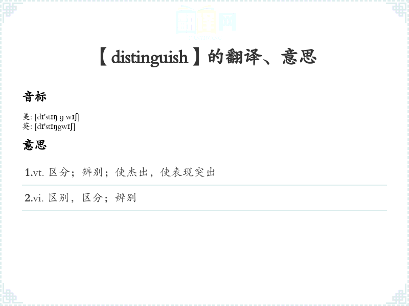1.vt. 区分;辨别;使杰出,使表现突出 2.vi. 区别,区分;辨别