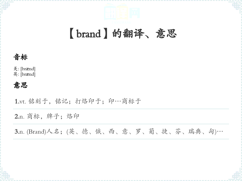 2.n. 商标,牌子;烙印 3.n. (Brand)人名;(英、德、俄、西、意、罗、葡、捷、芬、瑞典、匈)布兰德;(法)布朗