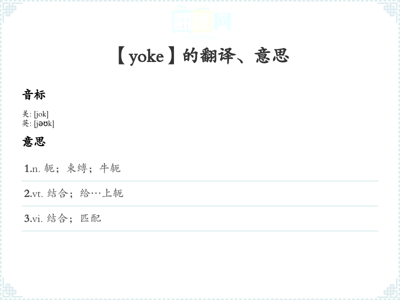 3.vi. 结合;匹配 4.n. (Yoke)人名;(日)与家(姓)