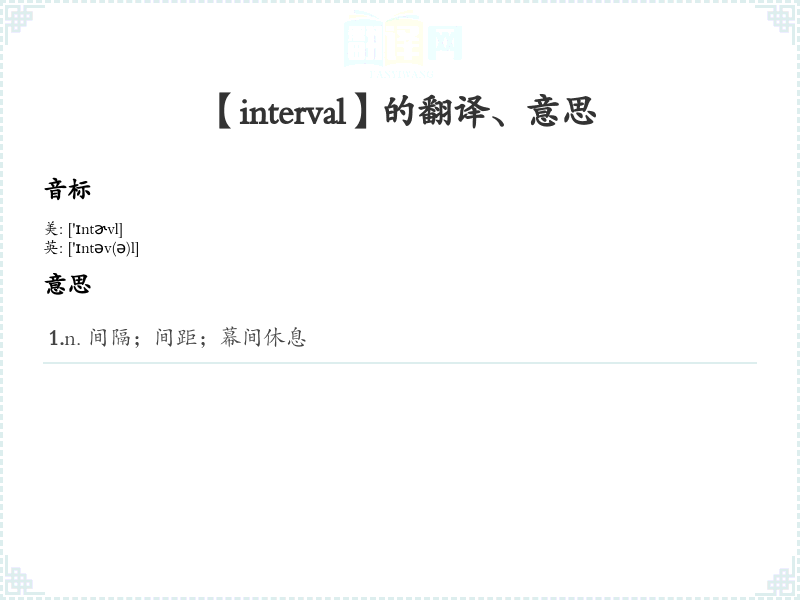 - 正式语境:在科学研究、数学讨论等场合中,interval 常用来表示时间段或空间距离。例如:“The study measured the interval between the two events.”(这项研究测量了两个**之间的间隔。)