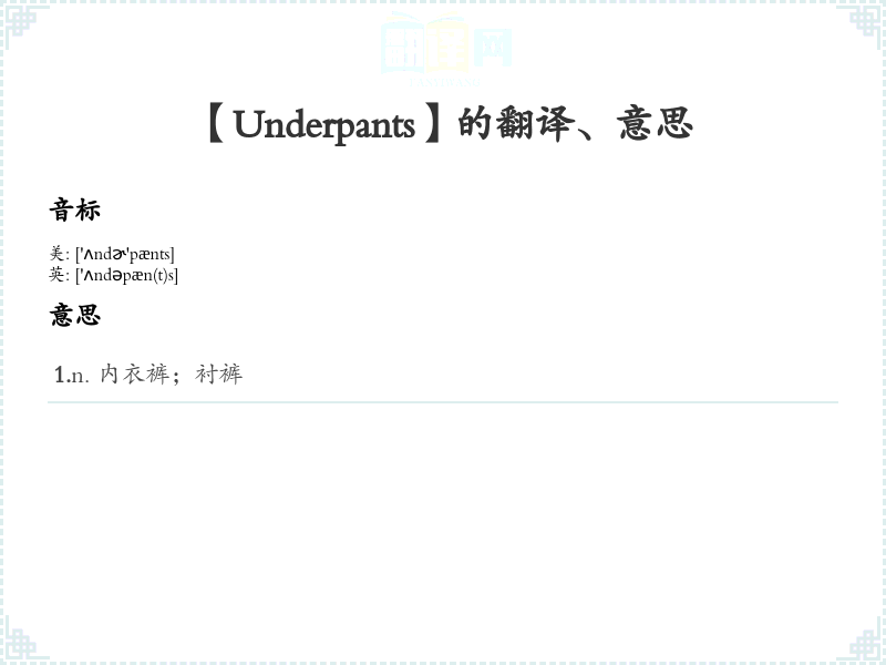 字面意思:Underpants指的是穿在外裤或裙子下面的内衣,通常是指男性或女性的内裤。