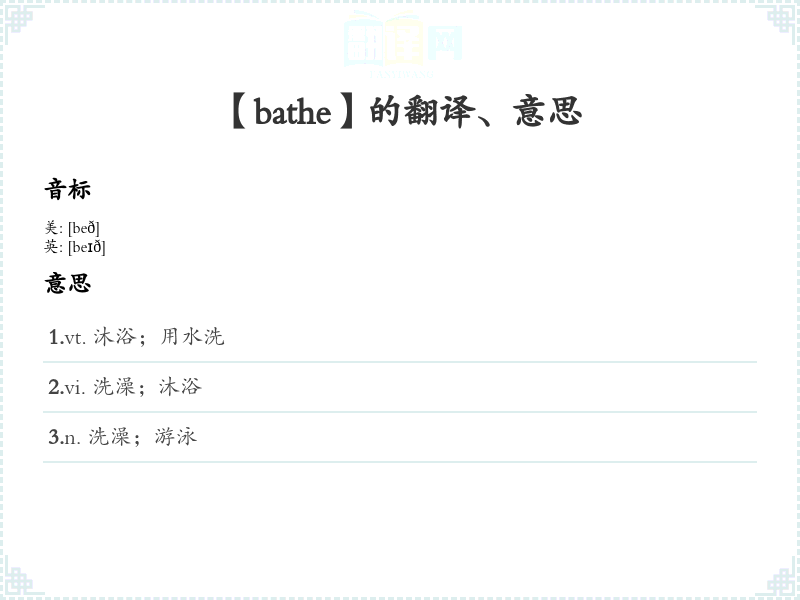 3.n. 洗澡;游泳 4.n. (Bathe)人名;(德)巴特;(英)巴思