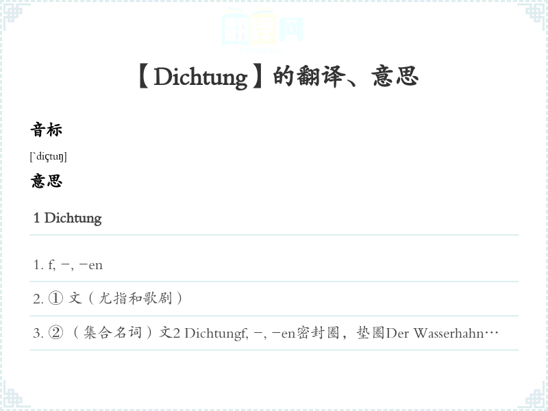 ② (集合名词)文2 Dichtungf, -, -en密封圈,垫圈Der Wasserhahn tropft, weil die Dichtung kaputt ist.水龙头滴水,是因为密封圈坏了。