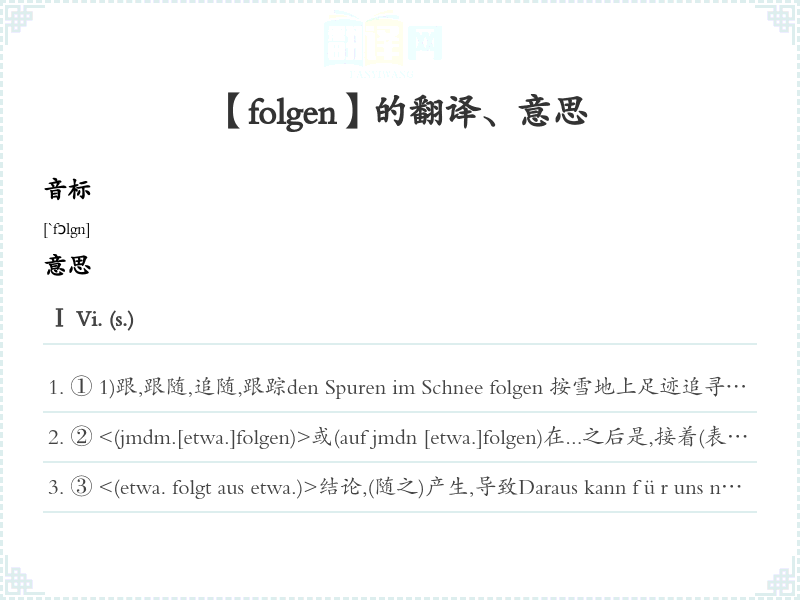 ① 1)跟,跟随,追随,跟踪den Spuren im Schnee folgen 按雪地上足迹追寻 2)(在... 之后)随着而来,(随后)跟上 Die Straße folgt dem Fluss. 这条街是顺着这条河流走向。 3)(理解地)倾听,听懂 jmds. Gedankengängen nicht folgen können 不理解某人思路 4)照着办,学(...样);遵循,依照,同意jmds. Beispiel folgen 按照某人榜样