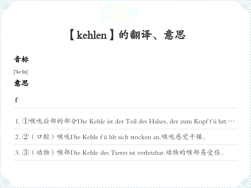 ①喉咙后部的部分Die Kehle ist der Teil des Halses, der zum Kopf führt.喉咙是连接头部的脖子部分。