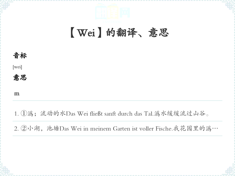 ①潙;流动的水Das Wei fließt sanft durch das Tal.潙水缓缓流过山谷。