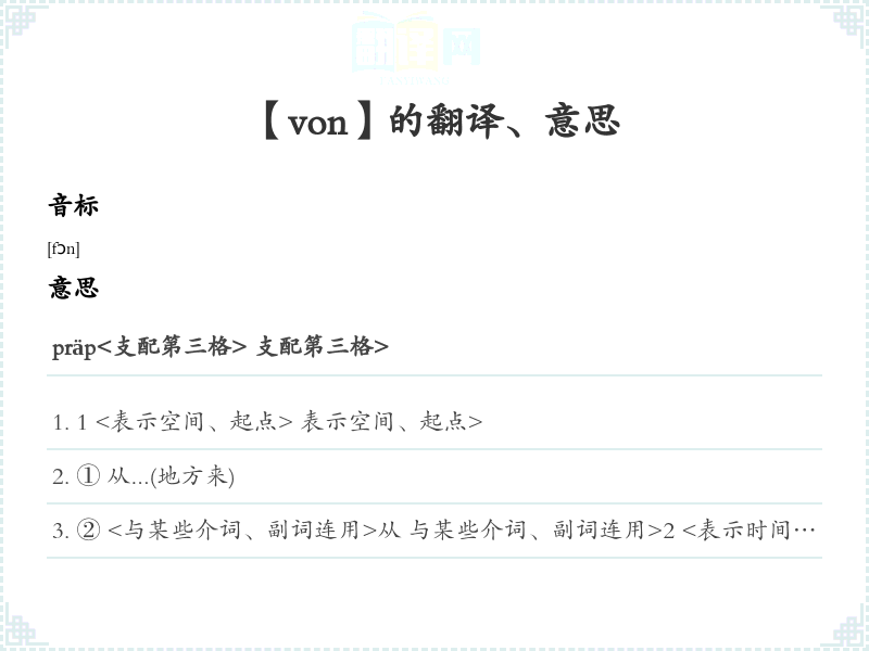② <与某些介词、副词连用>从 与某些介词、副词连用>2 <表示时间的起点>从...开始,从...起 表示时间的起点>Er musste von Jugend an schwer arbeiten.从青年时代开始就开始努力工作。Von morgen ab rauche ich nicht mehr.从明天起不再抽烟。Er kennt sie von der Schulzeit her.他从上(小,中)学时期开始就认识她了。3 <表示来源>从,由 表示来源>ein Stück von der Wurst abschneiden切下一块香肠einen Topf vom Herd nehmen把锅从灶上拿开sich den Schweiß von der Stirn abwischen擦去额头上汗4 <表示事物的所属,代替第二格定语>(属于或来源于)... 表示事物的所属,代替第二格定语>ein Brief von meiner Schwester 我妹妹寄信5 <表示整体中的部分>...中 表示整体中的部分>6 <表示某种特性、度量等>(具有或拥有)... 表示某种特性、度量等>ein Schrank von drei Meter Länge三米长柜子eine Reise von zwei Tagen两天旅行ein Kind im Alter von acht Jahren 孩子7 <用在被动态句中,表示行为的主体>被 用在被动态句中,表示行为的主体>8 <置于姓名之前,表示贵族称号,缩写:v.> 置于姓名之前,表示贵族称号,缩写:v.>9 <受某些形容词、动词的支配> 受某些形容词、动词的支配>10<用于固定搭配>用于固定搭配>