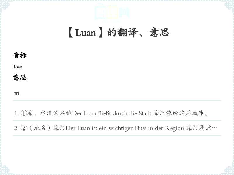 ②(地名)滦河Der Luan ist ein wichtiger Fluss in der Region.滦河是该地区的一条重要河流。