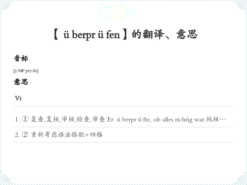 ① 复查,复核,审核,检查,审查 Er überprüfte, ob alles richtig war.他核查是否常。