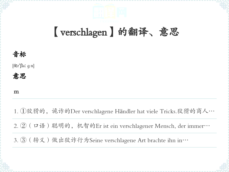 ①狡猾的,诡诈的Der verschlagene Händler hat viele Tricks.狡猾的商人有很多把戏。