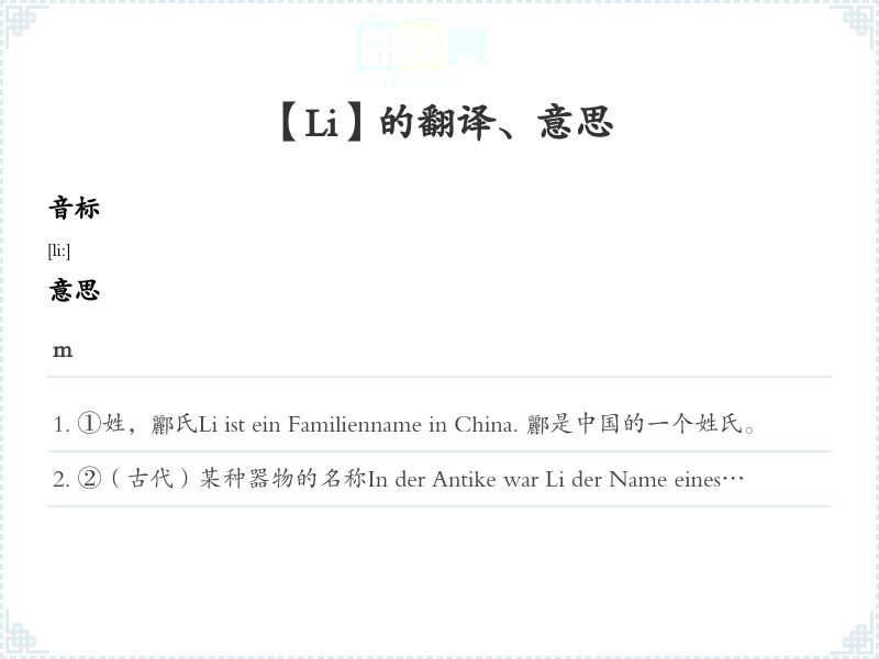 ②(古代)某种器物的名称In der Antike war Li der Name eines bestimmten Gerätes. 在古代,酈是某种器物的名称。