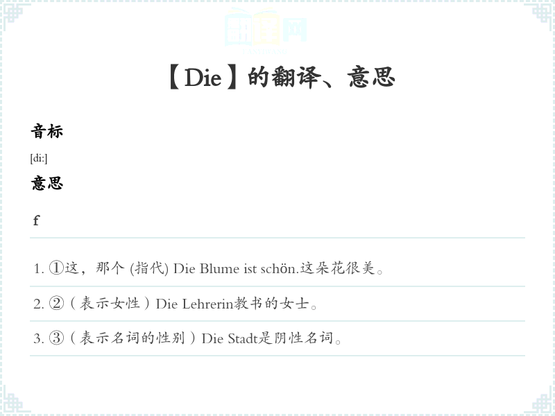 ①这,那个 (指代) Die Blume ist schön.这朵花很美。