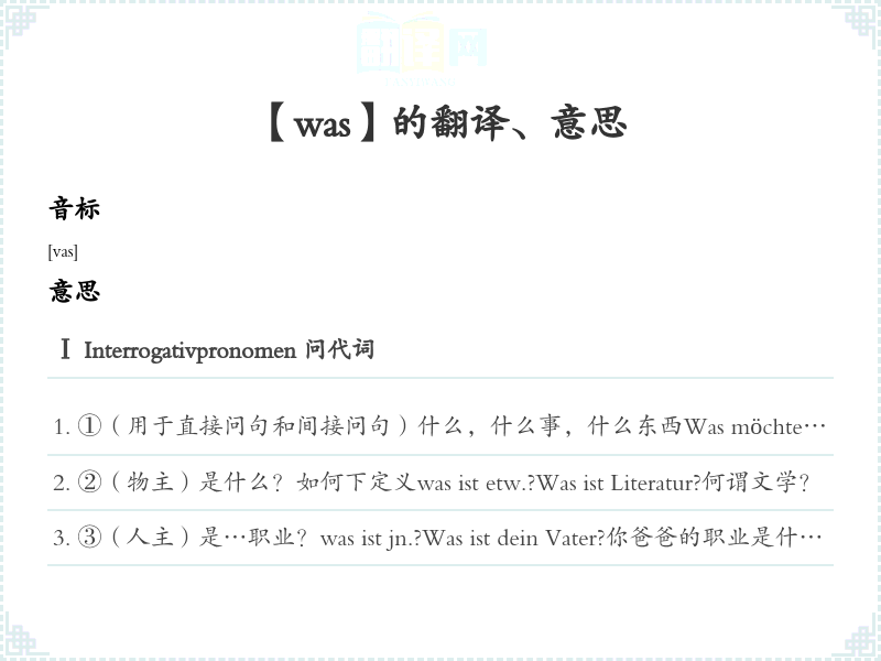 ⑤…样的?Was für ein/eine+ 名词Was für ein Wein möchtest du?你想要什么样的葡萄酒?Ⅱ Interjektion[](表示惊讶)什么!怎么!Was, das weißt du noch nicht?什么,你还不知道啊!ach was!什么乱七八糟的,什么呀(意为不信)Ⅲ Relativpronomen(关系代词)