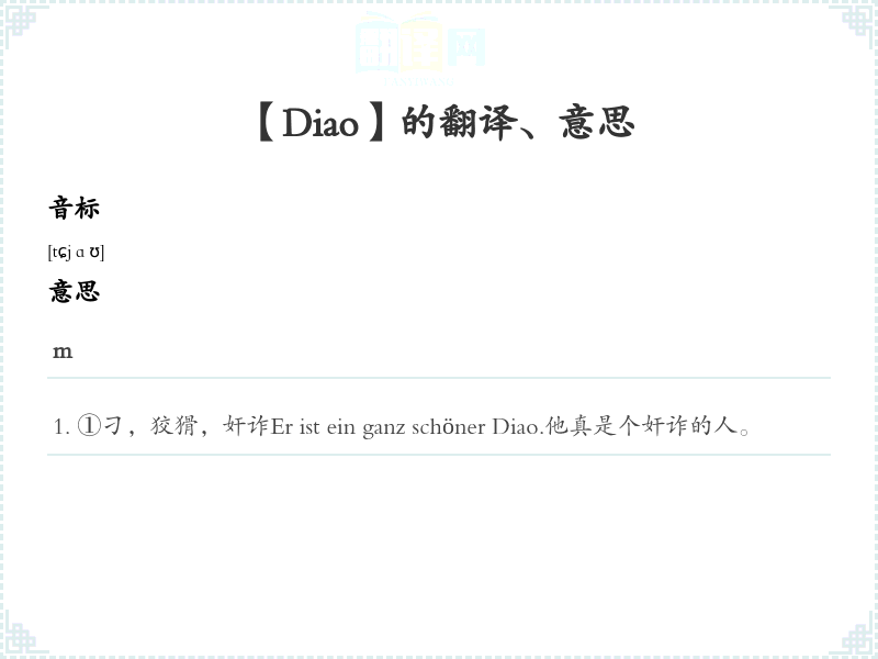 ①刁,狡猾,奸诈Er ist ein ganz schöner Diao.他真是个奸诈的人。
