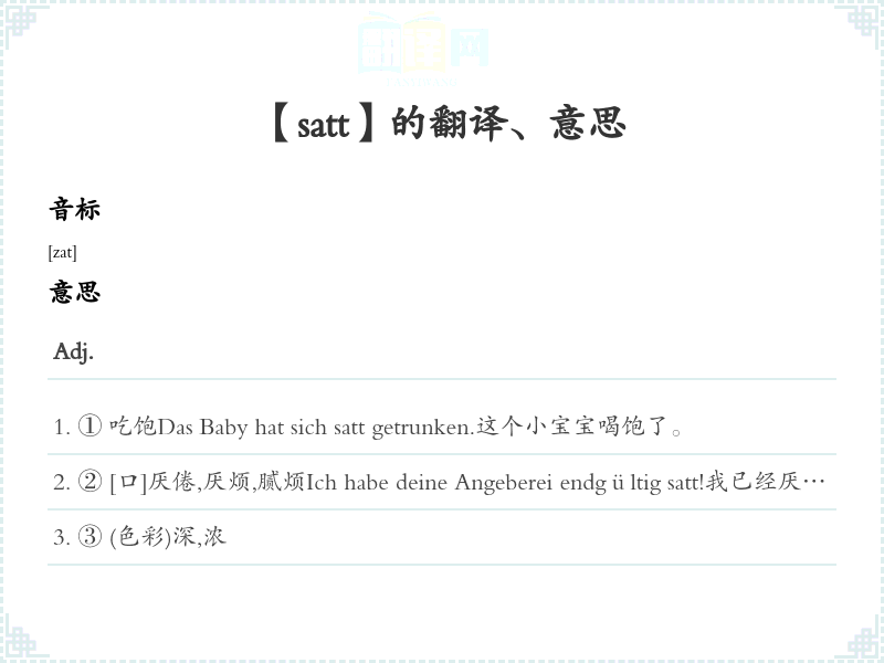 ② [口]厌倦,厌烦,腻烦Ich habe deine Angeberei endgültig satt!我已经厌倦了你吹牛。