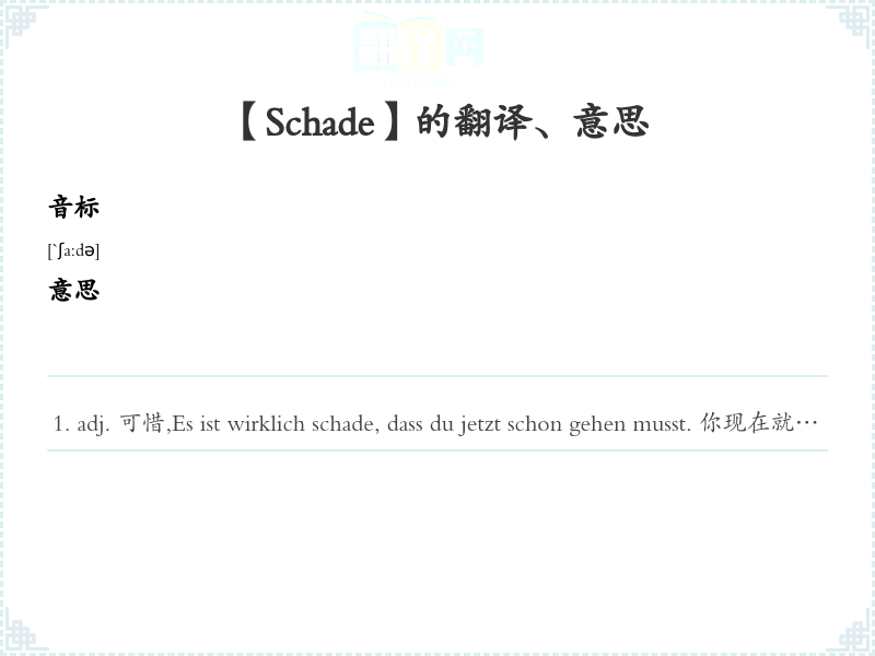adj. 可惜,Es ist wirklich schade, dass du jetzt schon gehen musst. 你现在就得走,真是。Schade! Da du wegbleibst. 你没出席真!