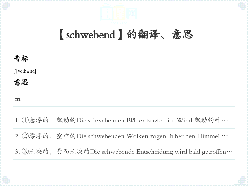 ①悬浮的,飘动的Die schwebenden Blätter tanzten im Wind.飘动的叶子在风中起舞。